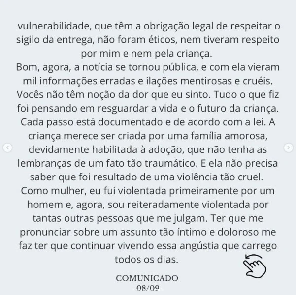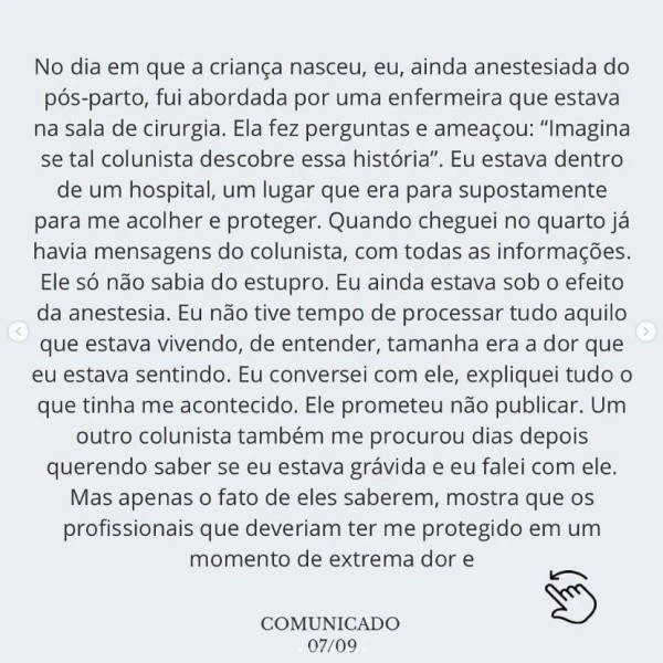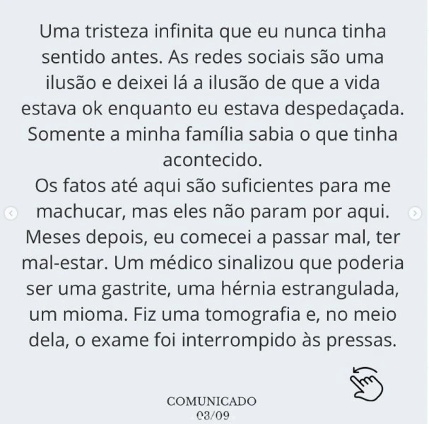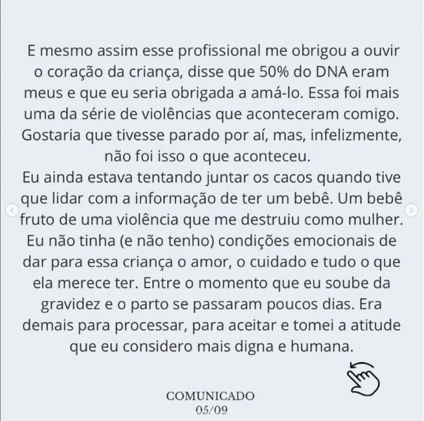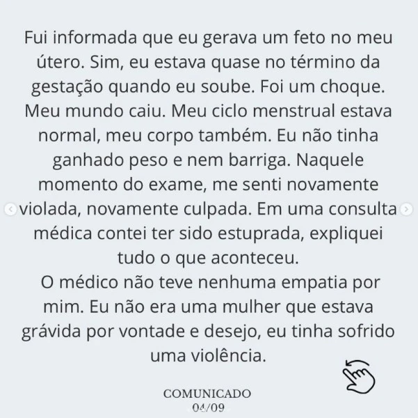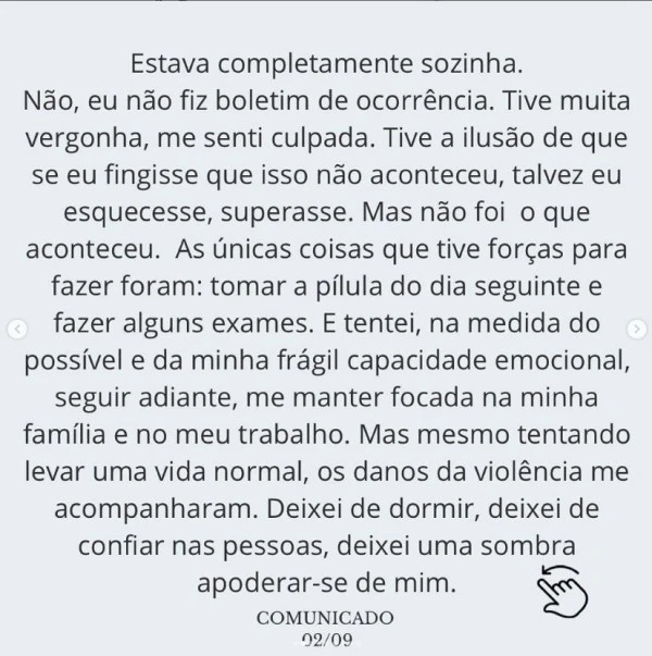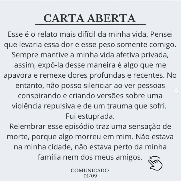 A publicação foi feita na noite deste sábado (25), após o assunto se tornar um dos mais comentados nas redes sociais. "Não posso silenciar ao ver pessoas conspirando e criando versões sobre uma violência repulsiva e um trauma que sofri", afirma ela. "Esse é o relato mais difícil da minha vida. Pensei que levaria essa dor e esse peso somente comigo."