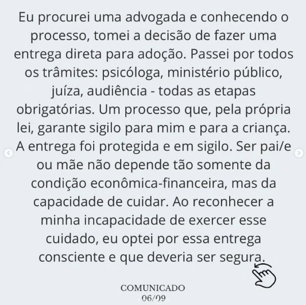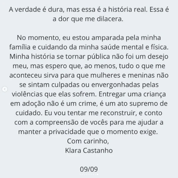 A atriz Klara Castanho, de 21 anos, publicou um relato em suas redes sociais e revelou que foi estuprada, engravidou e decidiu entregar o bebê diretamente para adoção.