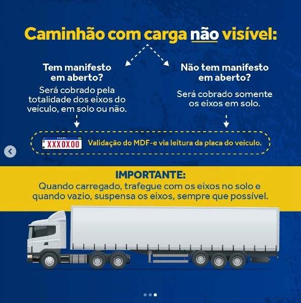 A verificação de cada veículo será automatizada, realizada pela leitura da placa por sistemas de identificação instalados nas praças de pedágio. Esses sistemas, integrados à plataforma da Secretaria da Fazenda Estadual, identificarão a existência de Manifesto Eletrônico de Documentos Fiscais (MDF-e) ou do Documento Auxiliar de Manifesto Eletrônico de Documentos Fiscais (DAMDFE). Se os documentos estiverem em vigor, a cobrança será efetuada considerando a totalidade de eixos do veículo, mesmo que alguns estejam suspensos.