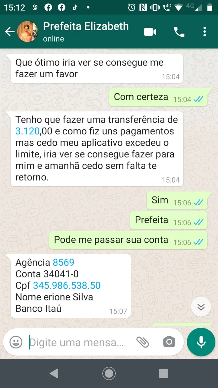 Prefeita pede às pessoas para desconsiderar as mensagens por WhatsApp que solicita transferências bancárias digitais; caso já foi comunicado a autoridades.