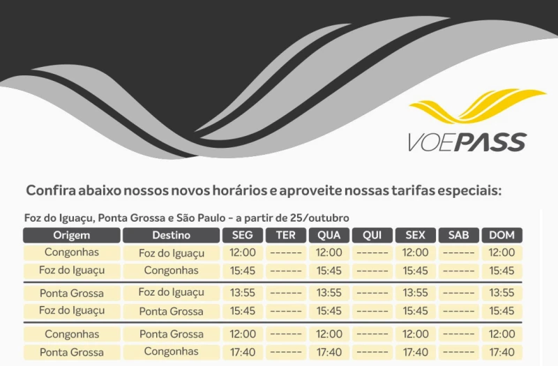 Após anunciar voos diários da cidade de Ponta Grossa a Foz do Iguaçu, o site da empresa já liberou para consulta e compra de passagens iniciando no dia 25 de outubro deste ano.