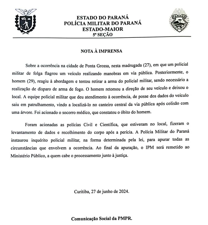 Leia abaixo na íntegra:“Sobre a ocorrência na cidade de Ponta Grossa, nesta madrugada (27), em que um policial militar de folga flagrou um veículo realizando manobras em via pública. Posteriormente, o homem (29), reagiu à abordagem e tentou tirar a arma do policial militar, sendo necessário a realização de disparo de arma de fogo. O homem retomou a direção de seu veículo e deixou o local. A equipe policial militar que deu atendimento à ocorrência, de posse dos dados do veículo, saiu em patrulhamento, vindo a localizá-lo no canteiro central da via pública após colisão com uma árvore. Foi acionado o socorro médico, que constatou o óbito do homem.