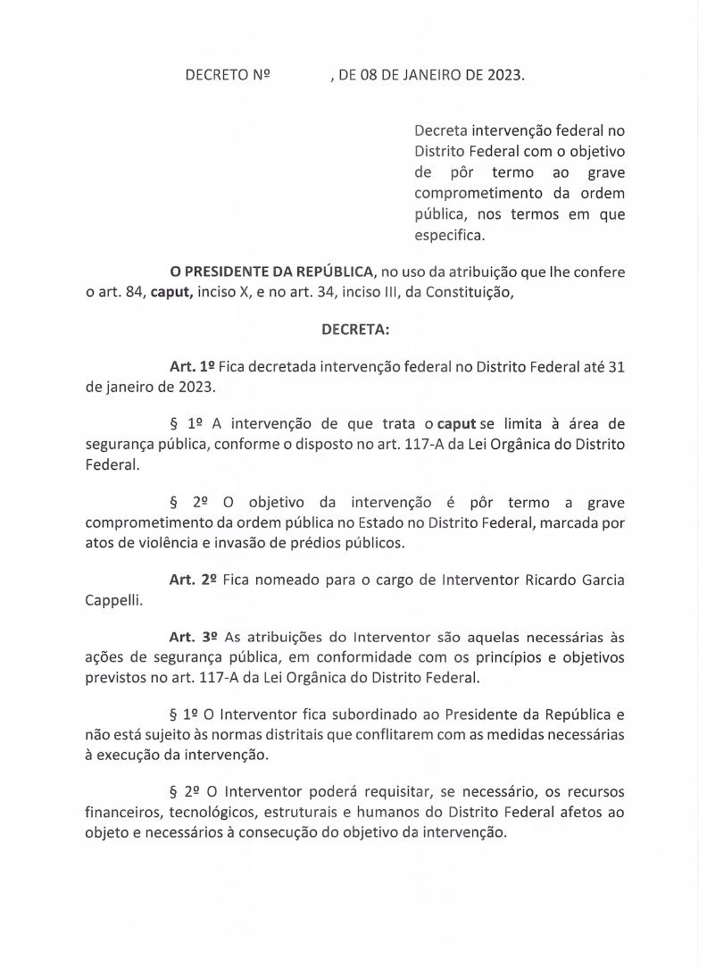 Após as invasões nas sedes dos Três Poderes em Brasília, na tarde deste domingo (8), o presidente Luiz Inácio Lula da Silva (PT) editou um decreto para decretar intervenção federal no Governo do Distrito Federal até o dia 31 de janeiro.