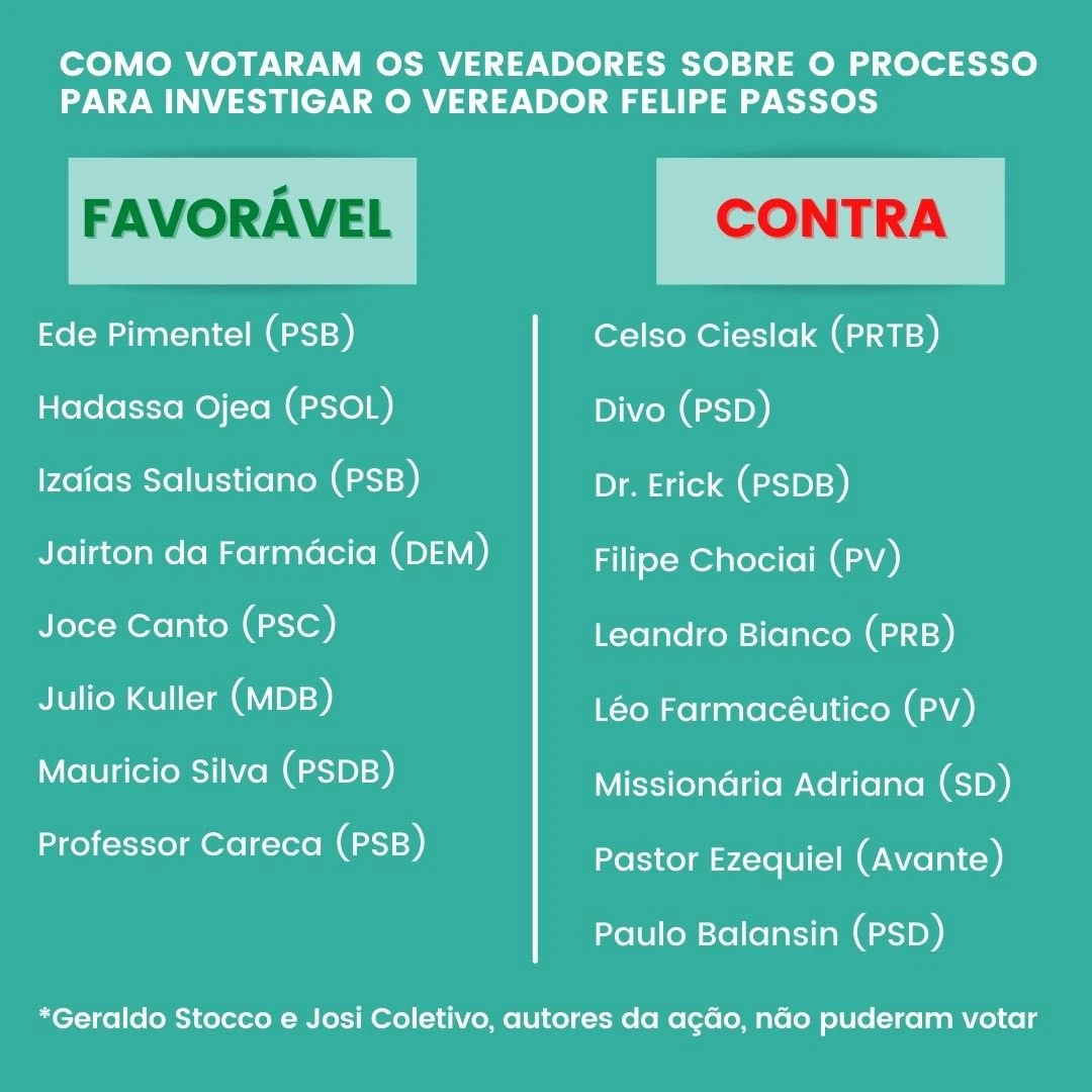 De acordo com o vereador Geraldo Stocco (PSB) – “passaram pano para todas as acusações do Ministério Público de assédio e rachadinha contra o vereador Felipe”, disse o vereador.