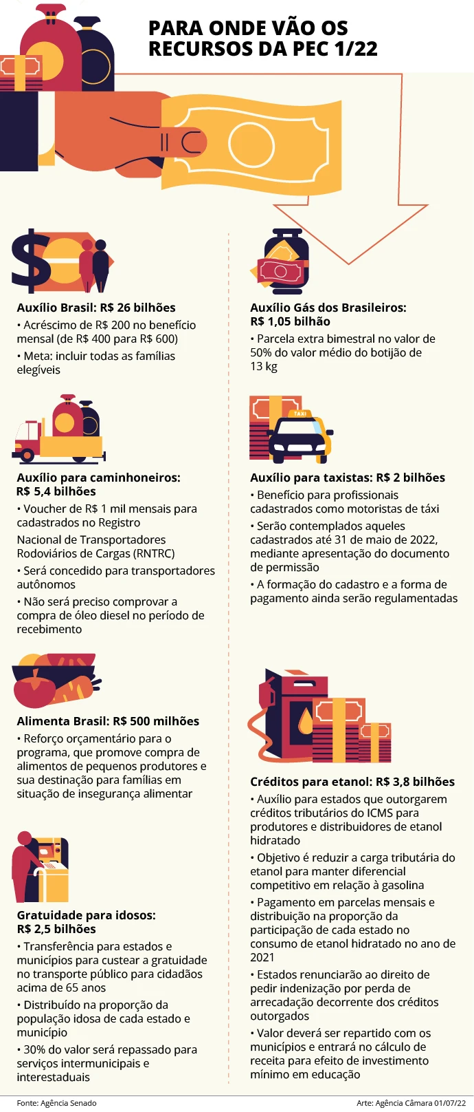 A PEC do Estado de Emergência permite ao governo gastar por fora do teto de gastos mais R$ 41,25 bilhões até o final do ano para aumentar benefícios sociais, conceder ajuda financeira a caminhoneiros e taxistas, ampliar a compra de alimentos para pessoas de baixa renda e diminuir tributos do etanol.