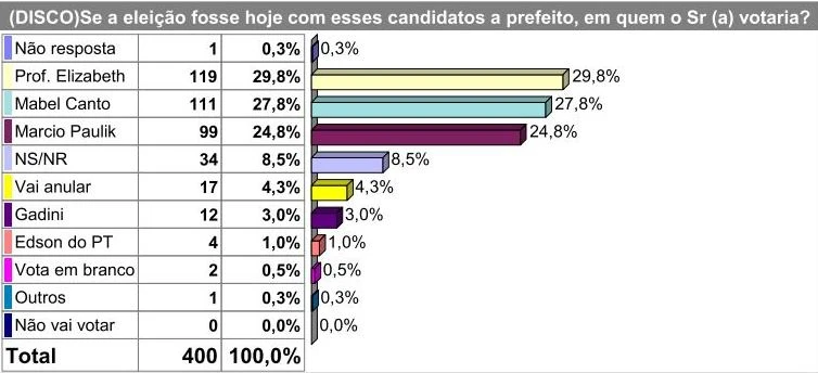 A pesquisa foi registrada sob nº 00324/2020 no TSEPesquisa realizada pelo Pesquisa Planejamento e Marketing (PPM) e divulgada nesta quarta-feira (11), mostra a atual vice-prefeita Elizabeth Schimdt (PSD) numericamente à frente na corrida eleitoral para a prefeitura de Ponta Grossa, com 29,8% das intenções de voto.