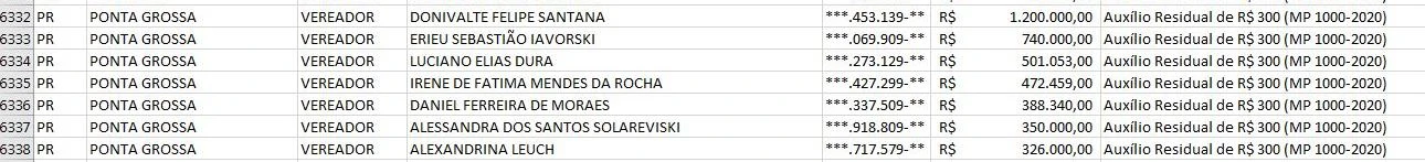 Veja / Lista de candidatos com patrimônio superior a R$ 300 mil que receberam o auxílio emergencial da Covid-19RECEBERAM AUXILIO EMERGENCIAL EM PONTA GROSSA OS SEGUINTES CANDIDATOS