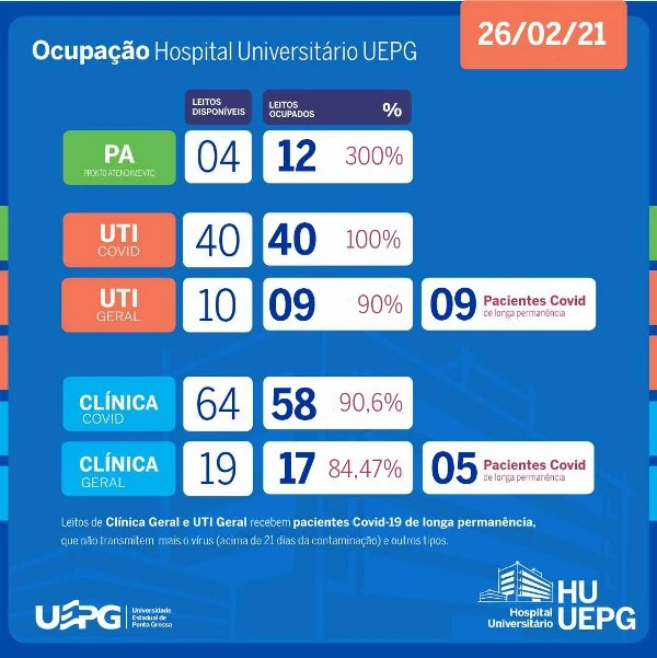 Apenas duas pessoas que não moravam em Ponta Grossa, porém estavam internadas em hospitais da cidade vieram a óbito por covid.De acordo com o Hospital Universitário Regional, 40 leitos de UTI- covid-19 estão ocupados, 10 leitos UTI geral, 09 estão ocupados.