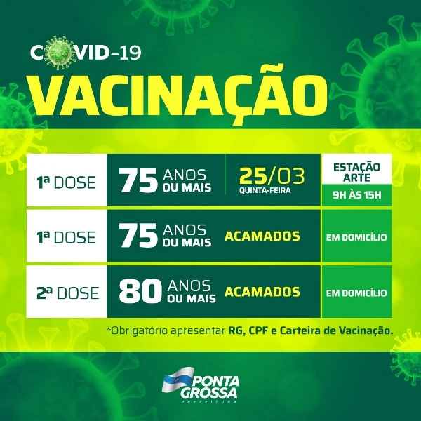 A Prefeitura Municipal de Ponta Grossa dará continuidade na imunização contra a covid-19 nesta quinta-feira (25). A Fundação de Saúde (FMS) estará com equipes na Estação Arte e também na residência do público-alvo acamado.